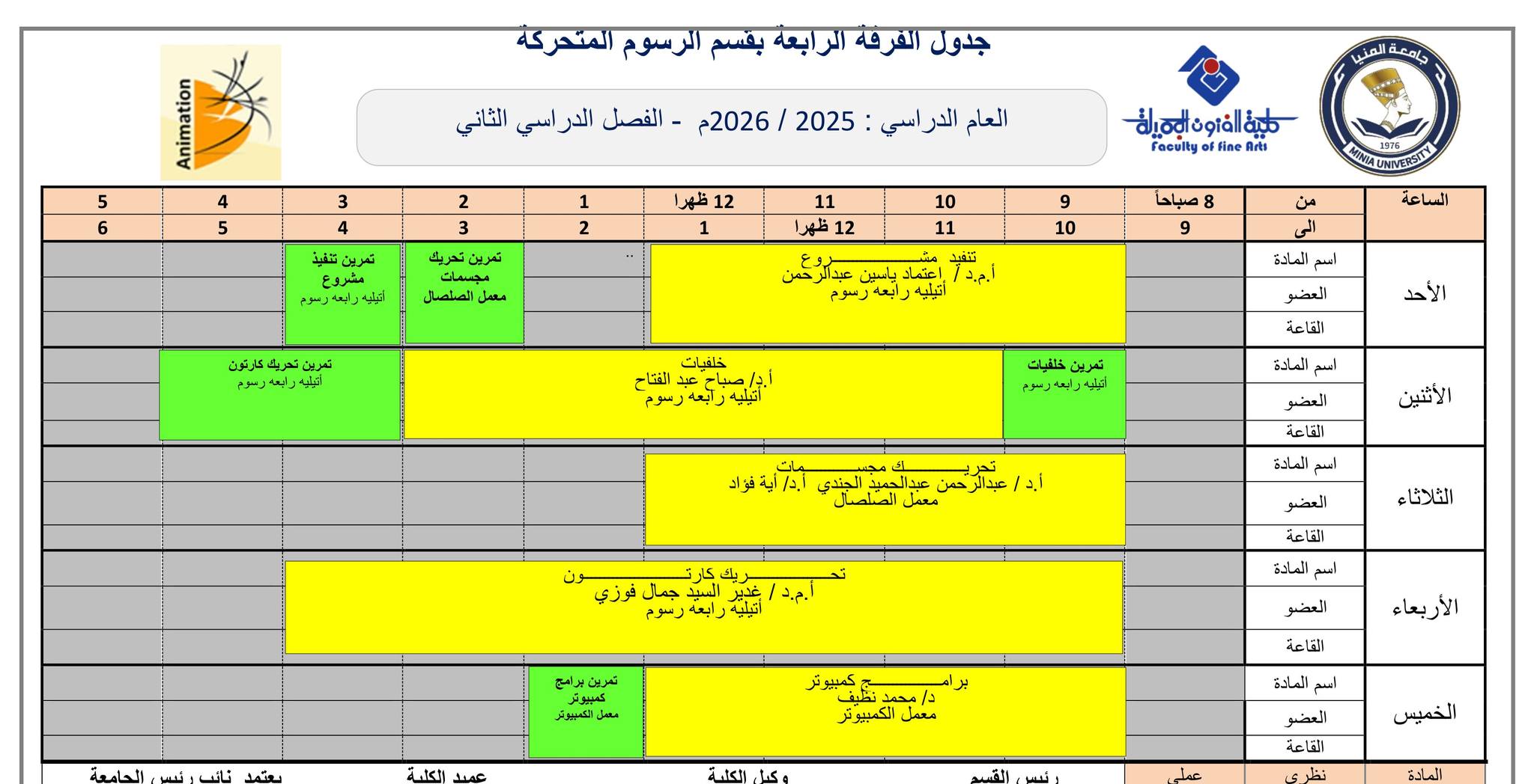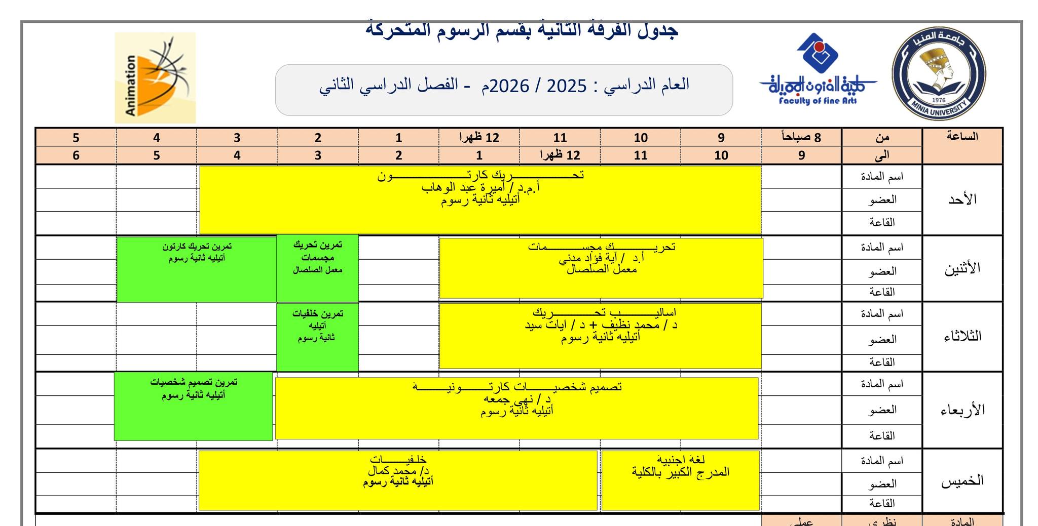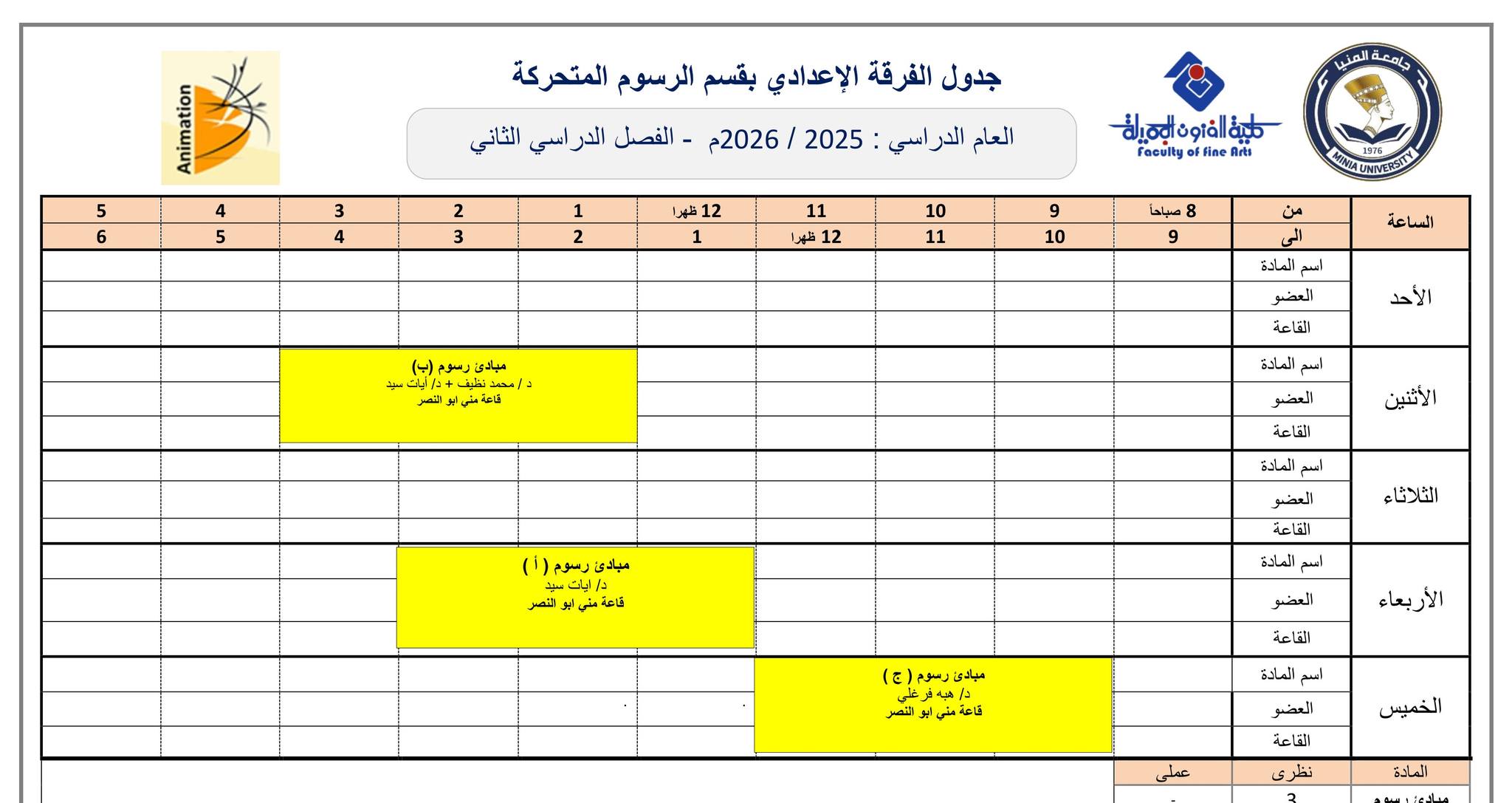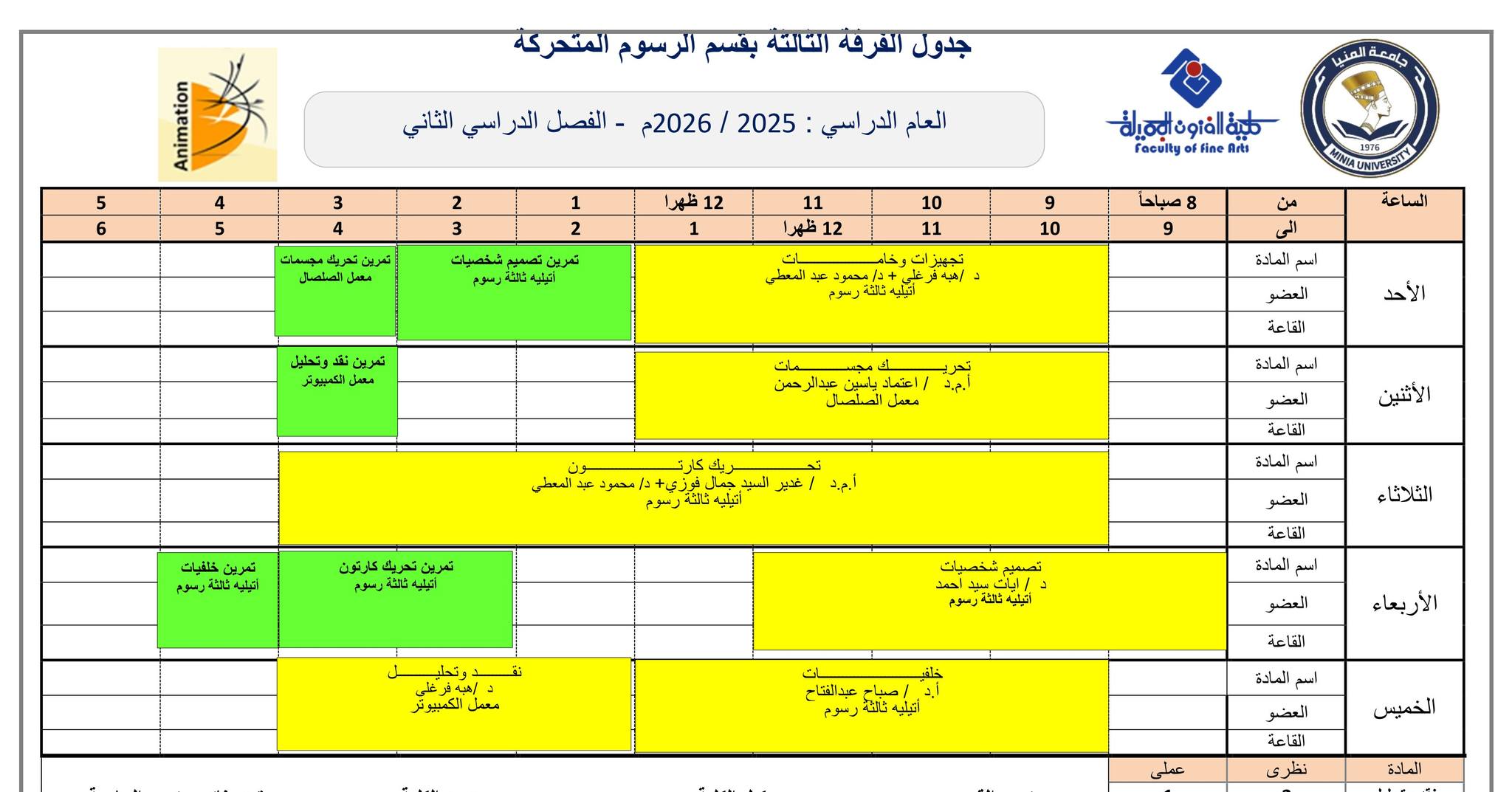 جدول الفصل الدراسي الثاني قسم الرسوم المتحركة كل الفرق