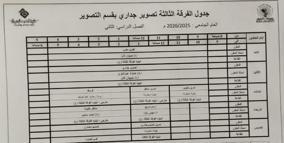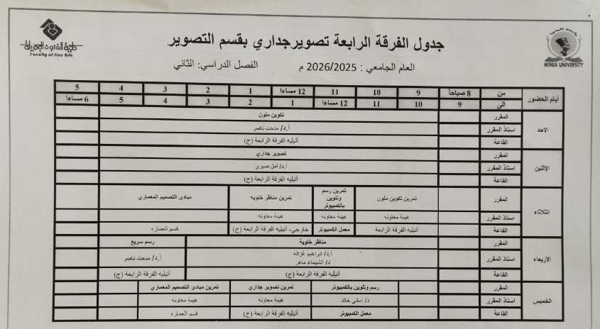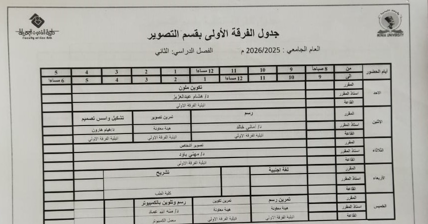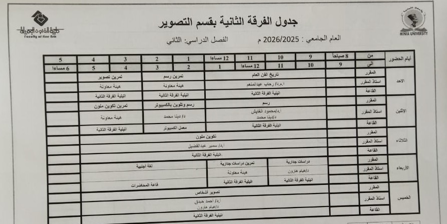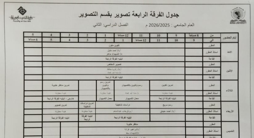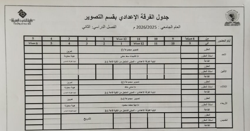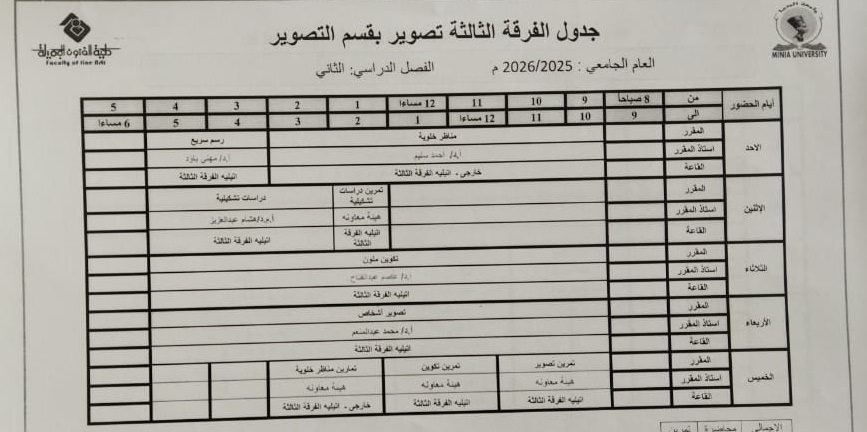 جدول الفصل الدراسي الثاني قسم التصوير كل الفرق