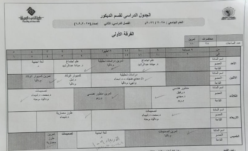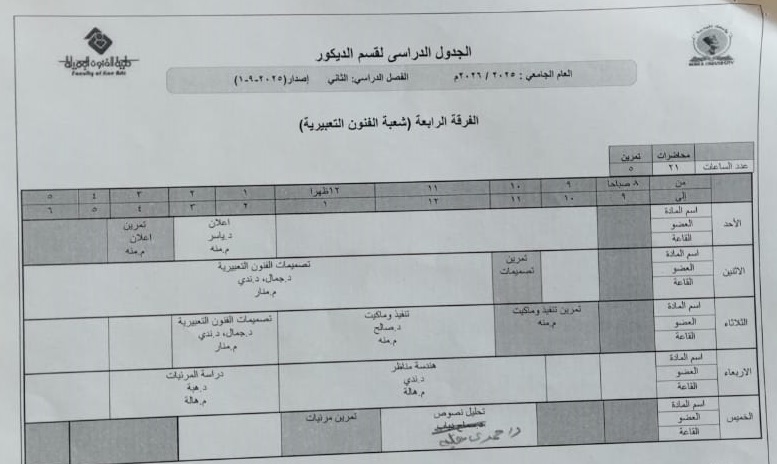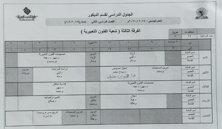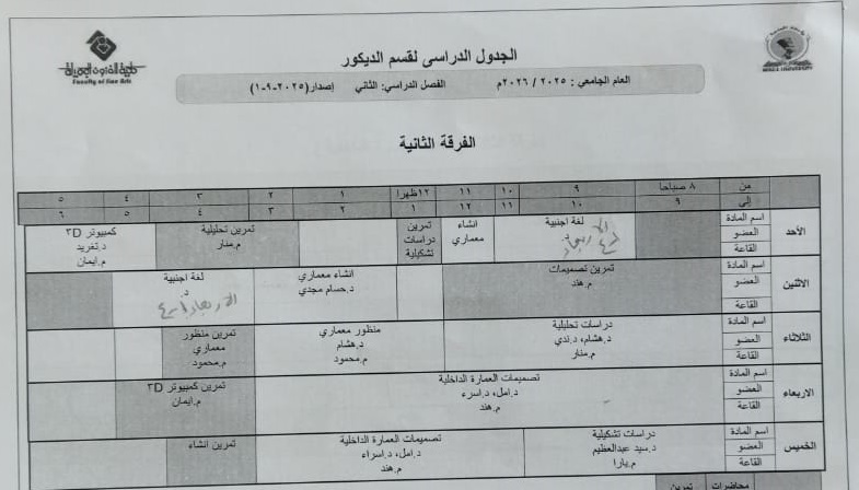 جدول الفصل الدراسي الثاني قسم الديكور كل الفرق
